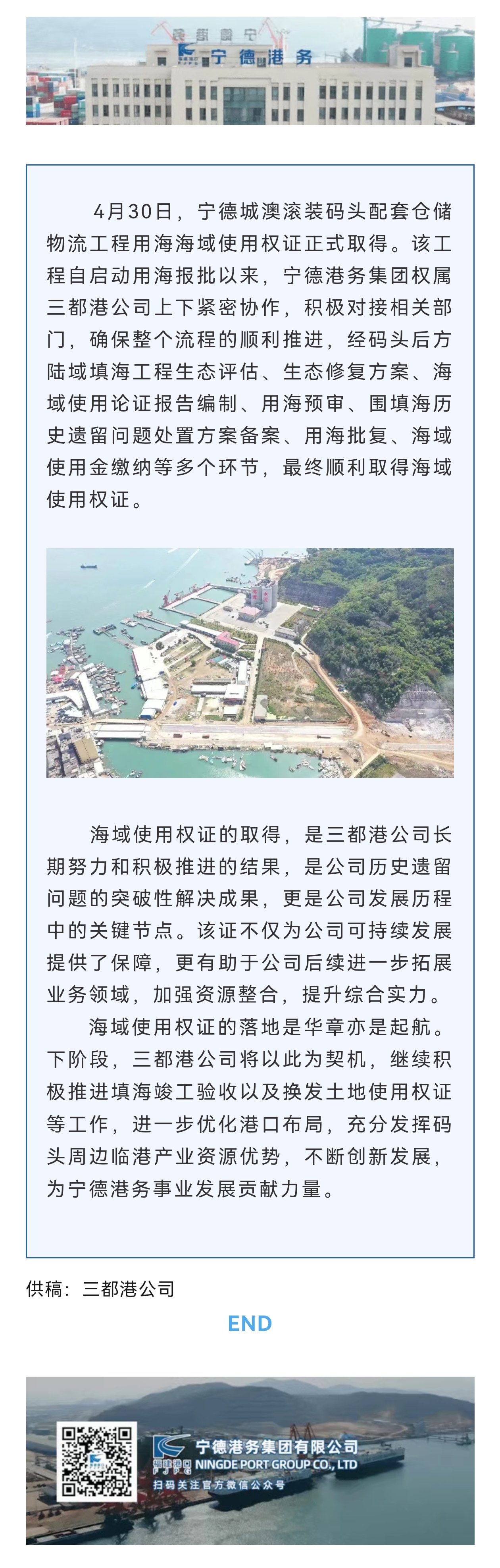 [歷史遺留問(wèn)題新突破|寧德城澳滾裝碼頭配套倉(cāng)儲(chǔ)物流工程取得海域使用權(quán)證 - 寧德港務(wù)集團(tuán)有限公司]